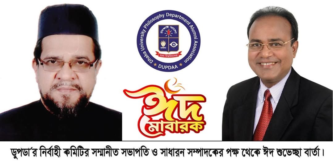 পবিত্র ঈদুল ফিতর উপলক্ষে ঢাকা বিশ্ববিদ্যালয় দর্শন বিভাগ এলামনাই এসোসিয়েশন, ডুপডা’র সভাপতি, ঢাবি দর্শন বিভাগের সম্মানিত চেয়ারম্যান প্রফেসর ডঃ শাহ মুস্তাফা কাওসার আবুলউলায়ী ও সাধারণ সম্পাদক লুৎফর রহমান ডুপডা’র নির্বাহী কমিটির পক্ষ থেকে দেশ বিদেশে অবস্থানরত ঢাকা বিশ্ববিদ্যালয় দর্শন বিভাগ এলামনাই এসোসিয়েশন, ডুপডা’র সকল সম্মানীত সদস্যবৃন্দকে আন্তরিক শুভেচ্ছা ও মোবারকবাদ জানিয়েছেন।